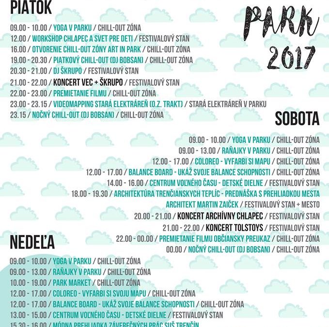 18. júna 2017Projekt Art In Park (Umenie v parku) už druhý rok sprevádza prebiehajúci filmový festival Trenčianske Teplice. Art In Park prináša umenie bližšie k ľuďom, štýlovou a modernou formou a kombinuje vizuálne inštalácie s koncertmi, workshopmi, módou a dobrým jedlom v chill-out zóne. Všetko prebieha v kúpeľnom parku pred reštauráciou Kursalon.