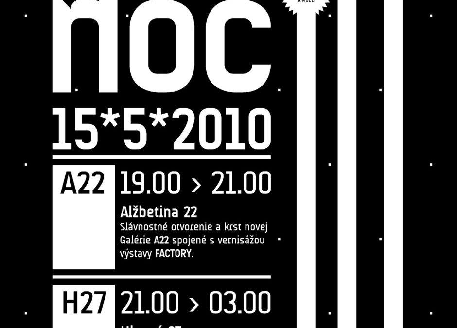 22. novembra 2015Multimediálnu umeleckú show pod názvom NOCNOC´10, v priestoroch Východoslovenskej galérie pri príležitosti Medzinárodného dňa múzeí a galérii, zažili všetci milovníci umenia, ktorí prišli do VSG na Alžbetinej a Hlavnej ulici. Úvodné dve hodiny boli v galerijných priestoroch na Alžbetinej ulici číslo 22, premenovaných na Galériu A22. „Kmotrom novej galérie“ sa stal známy sochár a multimediálny umelec Juraj Bartusz, pedagóg na Fakulte umení TU Košice. A práve prezentácia diel študentov tejto košickej školy priamo na stenách výstavných siení zahájila projekt Galérie A22.