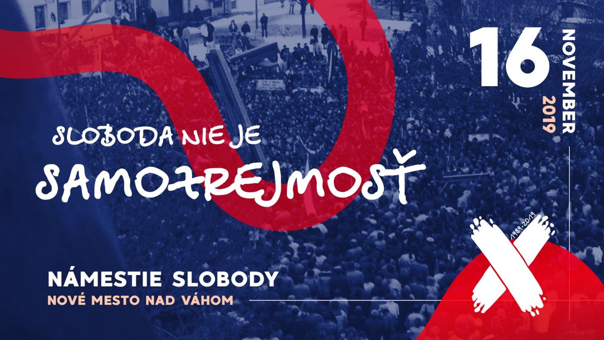 31. októbra 2019V Novom Meste nad Váhom sa 16.11.2019 uskutoční podujatie Sloboda nie je samozrejmosť, ktorým si pripomíname, 30. výročie Nežnej revolúcie. Rodí sa už druhá generácia, pre ktorú je sloboda a demokracia samozrejmosť. Chceme nám všetkým, bez ohľadu na rok narodenia, pripomenúť, že hoci niektoré veci v pamäti blednú, nie je to tak dávna doba, keď sloboda slova, cestovania, podnikania či vierovyznania boli hodnoty potláčané a stíhané. 17. november 1989 vnímame ako historický míľnik a veríme, že sme ako spoločnosť dostatočne vyzretí na to, aby sme si tieto udalosti pripomenuli bez zbytočného pátosu a polarizovania spoločnosti.