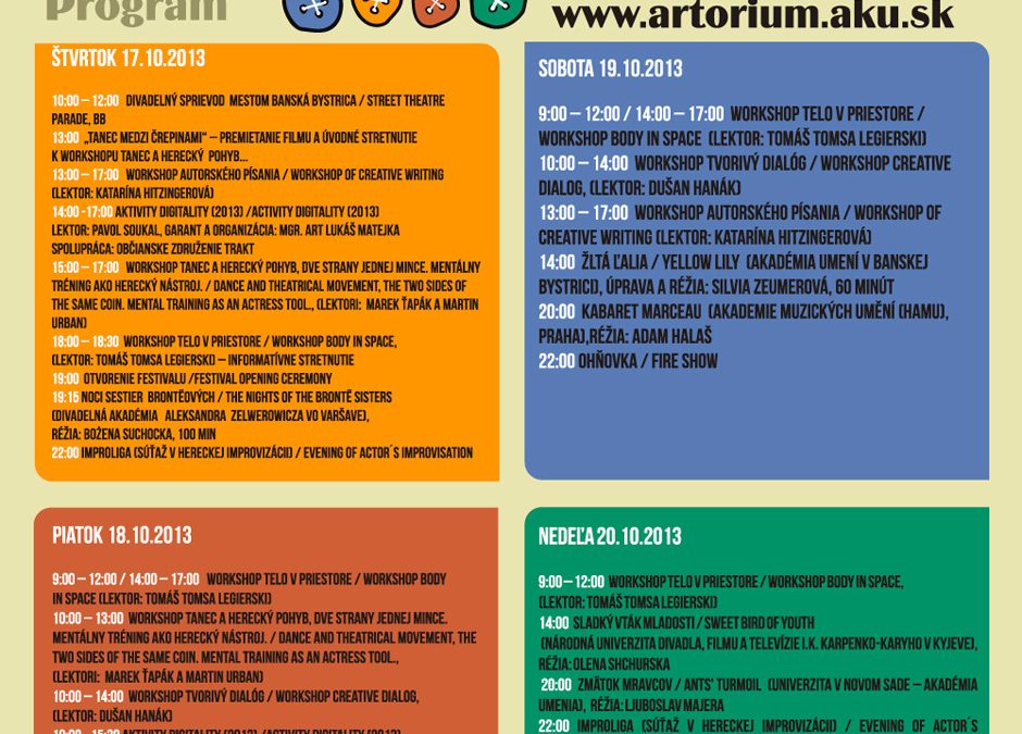 23. novembra 2015Akadémia umení opäť po roku otvorila festival Artorium 2013. Festival vysokých škôl sa uskutočnil tradične v Banskej Bystrici, medzi divadelnými predstaveniami sa uskutočnilo i niekoľko workshopov pre študentov. TRAKT pripravil pre festival workshop digitálneho umenia s názvom Aktivity digitality. Workshop svojou koncepciou nadviazal na predchádzajúce workshopy Aktivity interaktivity (2011), Aktivity vizuality (2012). Lektorom workshopu bol Pavol Soukal z VŠVU Bratislava a garantom Lukáš Matejka z FVU Akadémie umení v Banskej Bystrici. Účastníci workshopu, študenti katedry Intermédií a digitálnych médií Zoltán Bíro, Lucia Devecká, Zuzana Ďuricová, Simona Halečková, Marek Rečlo a Marek Salata sa naučili základy práce so softvérom VVVV, ktorý v praxi uplatnili do svojich autorských „work in progress“ projektov.
