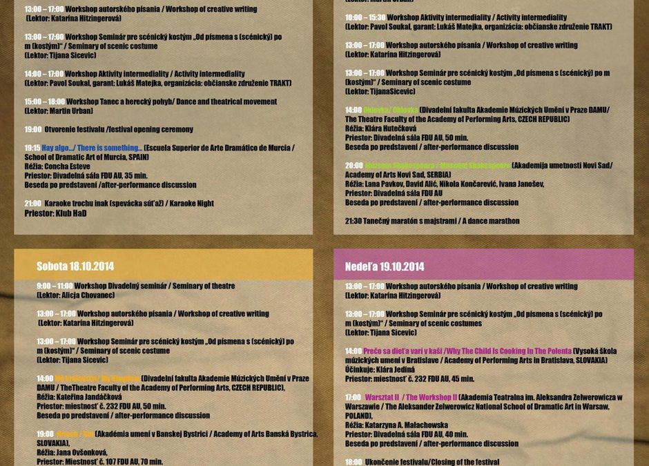 25. novembra 2015TRAKT pripravil v rámci festivalu ARTORIUM 2014 v Banskej Bystrici (na Fakulte dramatických umení – Akadémie umení) ďalší workshop zameraný na umenie nových médií. Workshop s názvom Aktivity intermediality nadväzuje na predchádzajúce artoriové workshopy. Garantom projektu bol Lukáš Matejka (TRAKT) a lektorom Pavol Soukal (TRAKT). 12 účastníkov workshopu bolo edukovaných do základov kreatívnej práce so sofvérom VVVV.