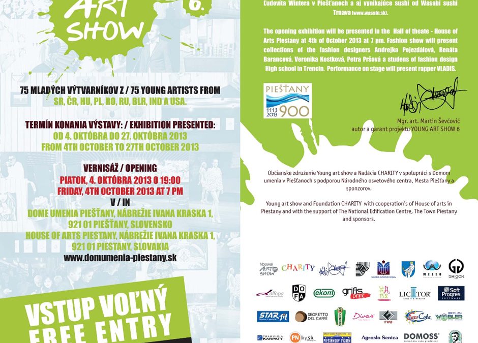 23. novembra 2015Projekt Young art show v koncepcií Mgr. art. Martina Ševčoviča tradične poskytuje priestor mladým talentom, študentom, či absolventom vysokých škôl s umeleckým zameraním na prezentovanie svojich umeleckých prác širokej verejnosti. Stretli sa tu diela výtvarníkov zo Slovenska, Česka, Maďarska, Poľska, Rumunska, Ruska, Bulharska, Indie a USA. Návštevníci mali možnosť priblížiť sa súčasnému umeniu prostredníctvom širokého spektra techník umeleckého spracovania rôznych tém.
